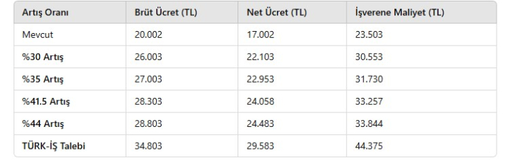 Komisyonda işçi tarafını temsil eden TÜRK-İŞ, net asgari ücret talebini 29 bin 583 TL olarak duyurdu. Bu rakam, brüt 34 bin 803 TL’ye denk gelirken işverene maliyeti ise 44 bin 375 TL olarak hesaplanıyor.
