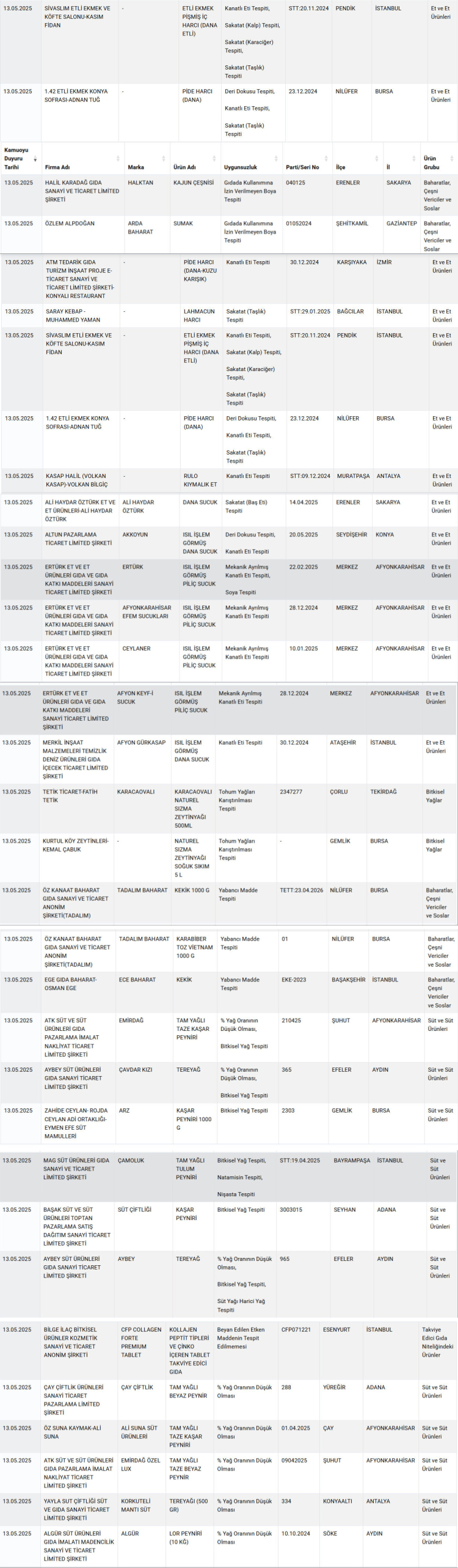 Tarım ve Orman Bakanlığı, gıdada yapılan hilelere karşı 81 ilde denetimlerini sürdürüyor. Denetimler sonucunda uygunsuz bulunan ürünler ve markaları kamuoyuyla paylaşılıyor.