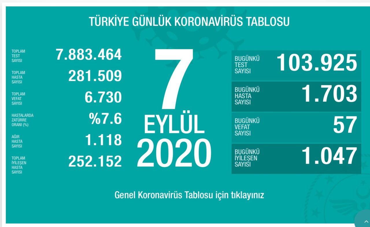 Türkiye'de bugün son 24 saat içerisinde 103 bin 925 Kovid-19 testi yapıldı. 1703 kişiye hastalık tanısı konuldu. 57 kişi Kovid-19 nedeniyle hayatını kaybetti. Ağır hasta sayısı 1118 oldu.