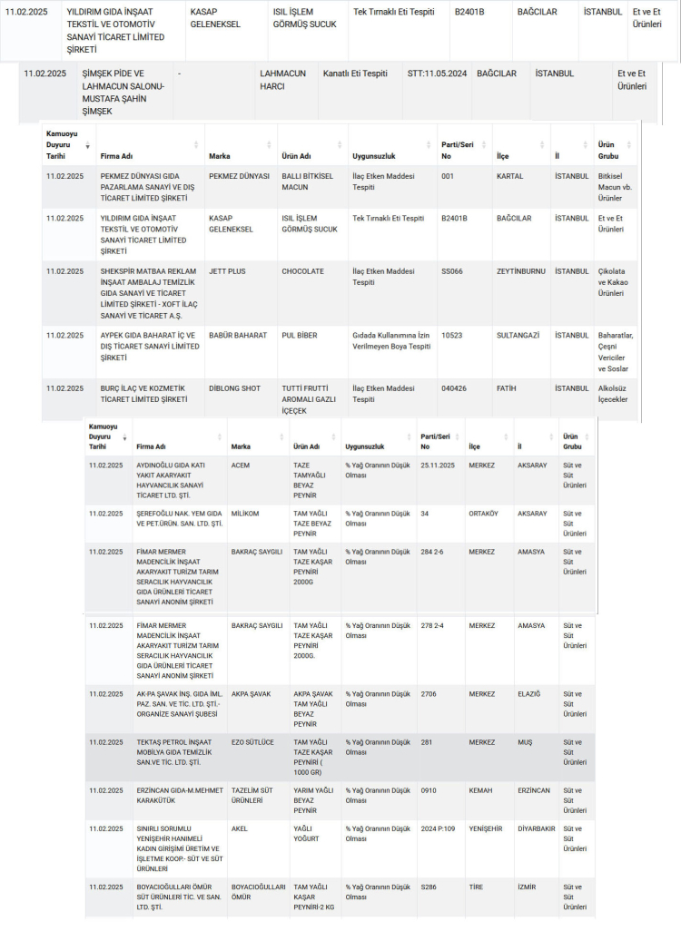 Bakanlık, listeyi bir kez daha güncelledi. 11 Şubat tarihli yeni listede yine şok edici detaylar bulunuyor. En mide bulandırıcı ayrıntı ise halka sucuk yerine at ve eşek eti yedirilmesiydi. Bağcılar'da bir kasabın sucuklarında tek tırnaklı at eti tespit edildiği açıklandı.