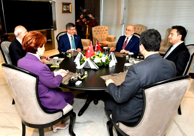 6'lı masa bugün beşinci kez toplandı. Saat 14'te başlayan toplantıya İYİ Parti Genel Başkanı Meral Akşener ev sahipliği yaptı. Akşener, konuklarını İYİ Parti Genel Merkezi'nin kapısında karşıladı.