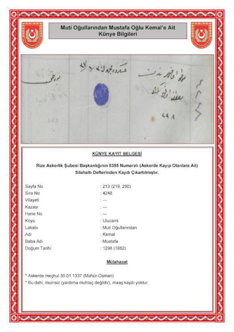 2018 yılında Millî Savunma Bakanlığı’ndan yapılan açıklamada, "Cumhurbaşkanımız Erdoğan'ın dedesi Mustafa oğlu Kemal’in, Sarıkamış Harekatı'na asker olarak katıldığı ve burada şehit düştüğü arşiv kayıtlarında 'askerde meçhul' ifadeleriyle kesin olarak yer almaktadır" denilmişti.