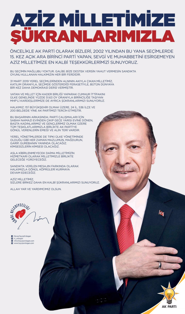 AK Parti'nin resmi Twitter hesabından yerel seçimle ilgili bir paylaşım geldi. 15 büyükşehir kazanıldığını ‘Aziz milletimize şükranlarımızla' notuyla paylaşılan bilgide İstanbul, kazanılan iller arasında yer almadı.