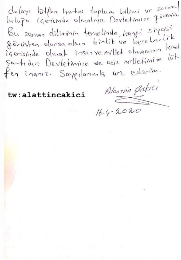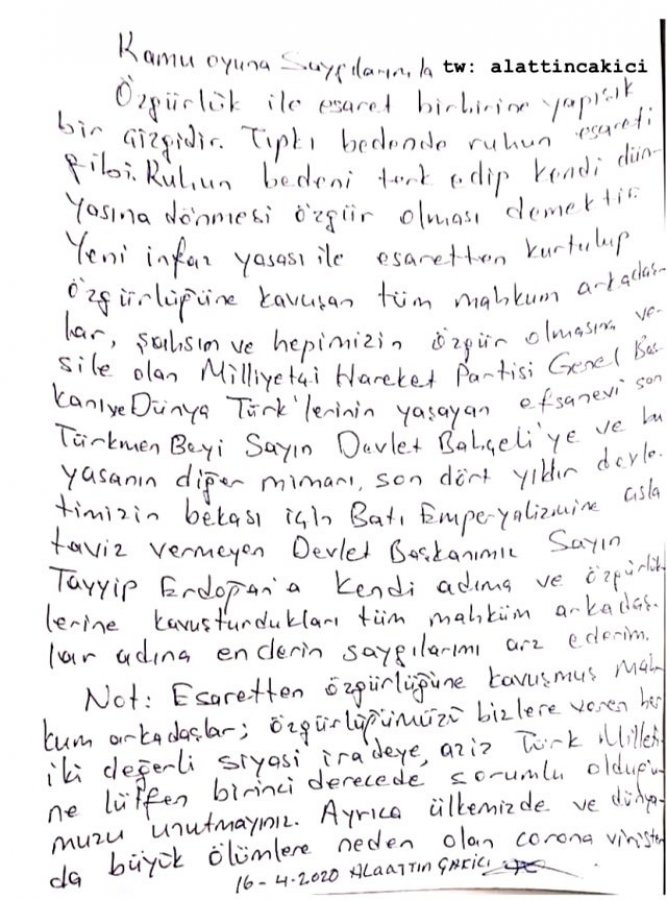 Alaattin Çakıcı, burada el yazısıyla bir mektup yazarak Cumhurbaşkanı Erdoğan ile MHP Genel Başkanı Bahçeli'ye teşekkür etti.
