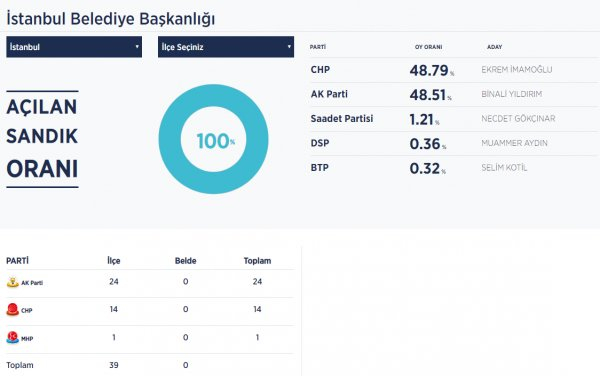 Anadolu Ajansı'nın açıklamalarına göre İmamoğlu oyların yüzde 48,79'unu aldı ve AK Partili Binali Yıldırım da 48.51'de kaldı.