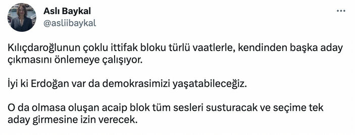 "İyi ki Erdoğan var" diyen Aslı Baykal, paylaşımında şu ifadeleri kullandı: "Kılıçdaroğlu'nun çoklu ittifak bloku türlü vaatlerle, kendinden başka aday çıkmasını önlemeye çalışıyor.