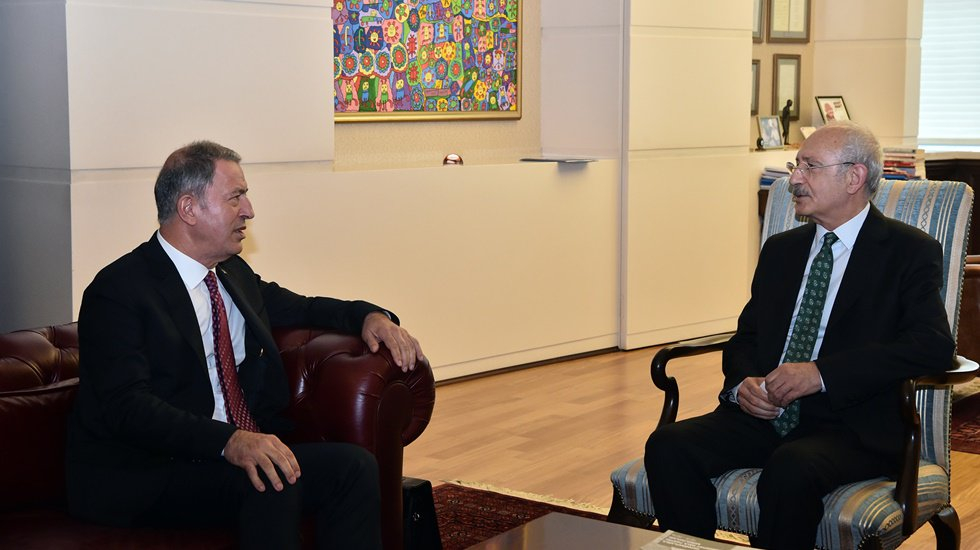 Kılıçdaroğlu, Milli Savunma Bakanı Hulusi Akar ve beraberindeki heyet ile birlikte parti genel merkezindeki makamda bir araya geldiler.