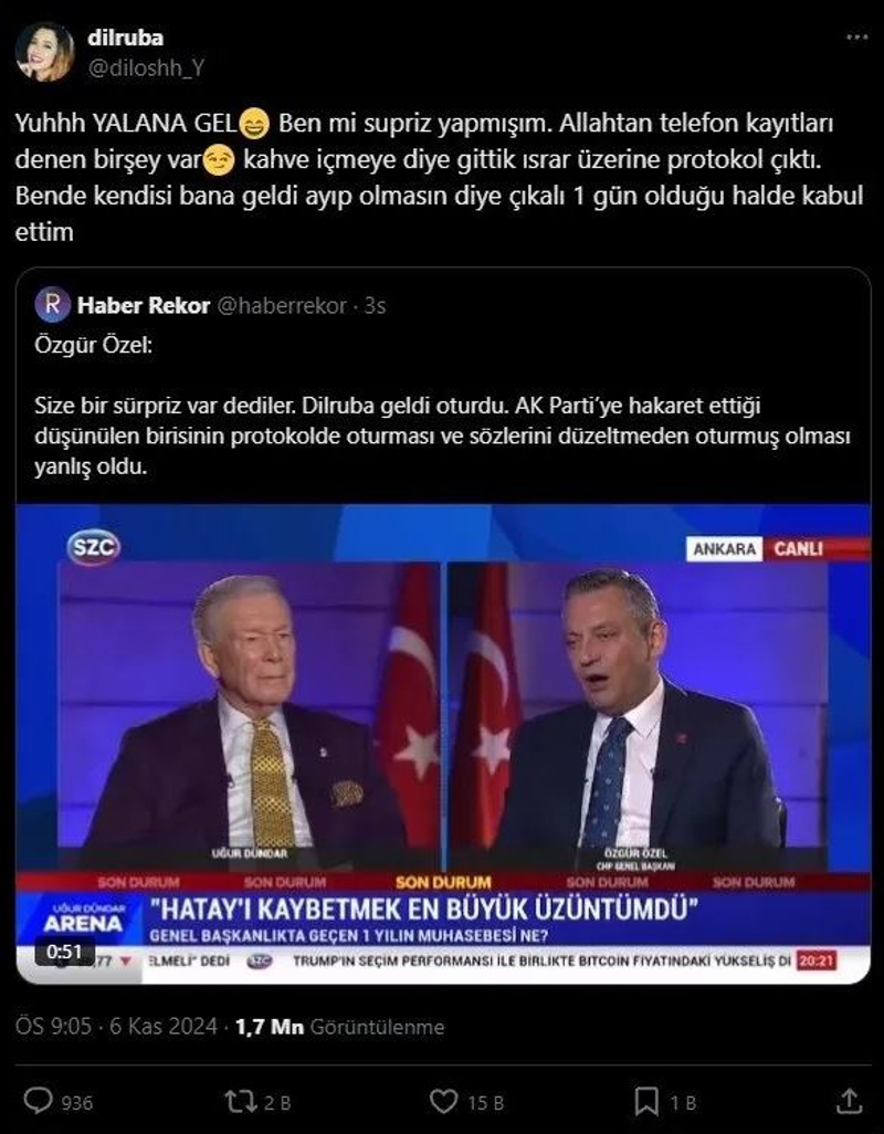 CHP Genel Başkanı Özgür Özel, Cumhurbaşkanı Erdoğan'a ve AK Parti seçmenine küfreden Dilruba Kayserilioğlu'nu İzmir'de protokolde ağırlamış ve alkışlatmıştı. Sözcü TV canlı yayınına konuk olan Özel, yaşananlara ilişkin pişmanlık duyduğunu belirtip, "AK Parti'ye hakaret ettiği düşünülen birisinin protokolde oturması yanlış oldu" dedi. Özel'in açıklamaları sonrası X hesabından paylaşım yapan Kayserilioğlu, CHP Genel Başkanı'na 'yalancı' deyip 'gerekirse telefon kayıtlarını açıklayacağını' söyledi.