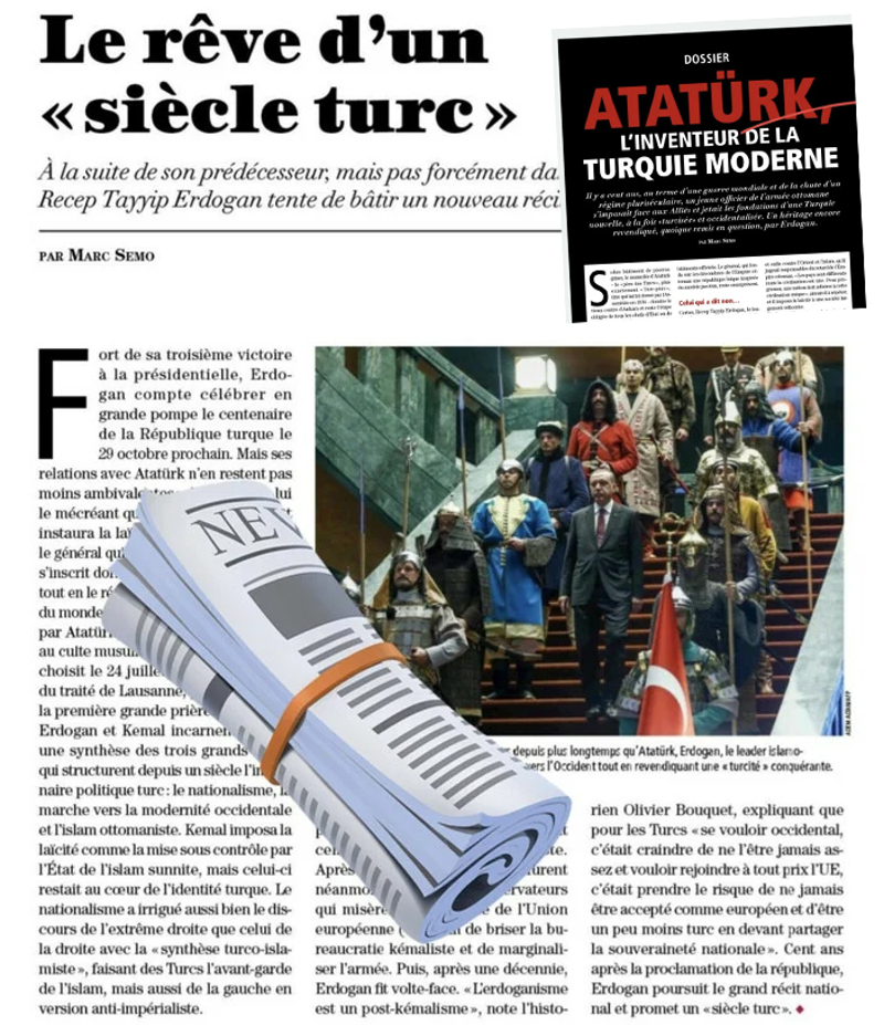 100. yılını büyük bir coşkuyla kutlamaya hazırlanan Türkiye'nin dünü ve bugününe ilişkin bir analiz yayımlayan Fransız tarih dergisi Historia, Cumhurbaşkanı Erdoğan'ın günümüzde yeni bir ulusal anlatı oluşturmaya çalıştığını belirterek, 'Cumhurbaşkanı Erdoğan, Atatürk'ün mirasını kendi dünya vizyonu ışığında yeniden yazıyor' ifadelerini kullandı.