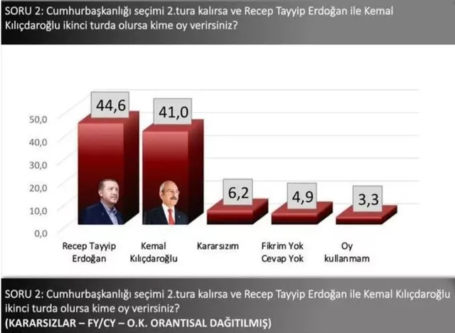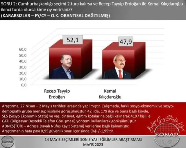 14 Mayıs'ta yapılacak seçimlere 10 gün gibi kısa bir süre kalırken, anket şirketleri de son seçim anketlerini kamuoyuyla paylaşmaya devam ediyor. Son olarak SONAR Araştırma Başkanı Hakan Bayrakcı, seçimlerle ilgili son anketi CNN Türk ekranlarında Ahmet Hakan ile Tarafsız Bölge programında paylaştı. "14 Mayıs'ta yapılacak olan seçimlerde Cumhurbaşkanlığı için kime oy vermeyi düşünüyorsunuz?" sorusunun yöneltildiği anket, 41 ilde 4 bin 197 kişiyle yapıldı.