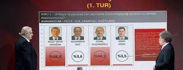 SONAR'ın tespiti bu. Sinan Oğan yükseldi. Eğer seçmende 2'li polarizasyon olmasaydı Muharrem İnce 8-9'dan aşağı olmazdı. Bizim rakamlarımız 1, 1,5 olarak aşağı ve yukarı da oynayabilir. Ben bu rakamlara kefilim. Aksini söyleyen herkesle de hesaplaşmaya hazırım. İstatistikte bir kural vardır. Az rakamlar daha az, çok rakamlar daha çok çıkar. Dün bile anketi yapıldı bunun. 42 ilde yapıldı.
