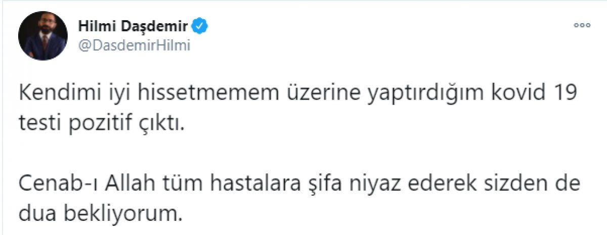 Hilmi Daşdemir'in açıklaması şu şekilde: "Kendimi iyi hissetmemem üzerine yaptırdığım kovid 19 testi pozitif çıktı. Cenab-ı Allah tüm hastalara şifa niyaz ederek sizden de dua bekliyorum."