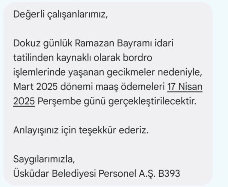 Belediye, personeline gönderdiği bir SMS ile maaş ödemelerinin gecikeceğini duyurdu. SMS'te, bordro işlemlerindeki gecikmenin Ramazan Bayramı'ndaki dokuz günlük idari tatilden kaynaklandığı belirtildi. Üsküdar Belediyesi'nin açıklamasında, "Değerli çalışanlarımız, dokuz günlük Ramazan Bayramı idari tatilinden kaynaklı bordro işlemlerinde yaşanan gecikmeler nedeniyle, Mart 2025 dönemi maaş ödemeleri 17 Nisan 2025 Perşembe günü gerçekleştirilecektir. Anlayışınız için teşekkür ederiz" denildi.