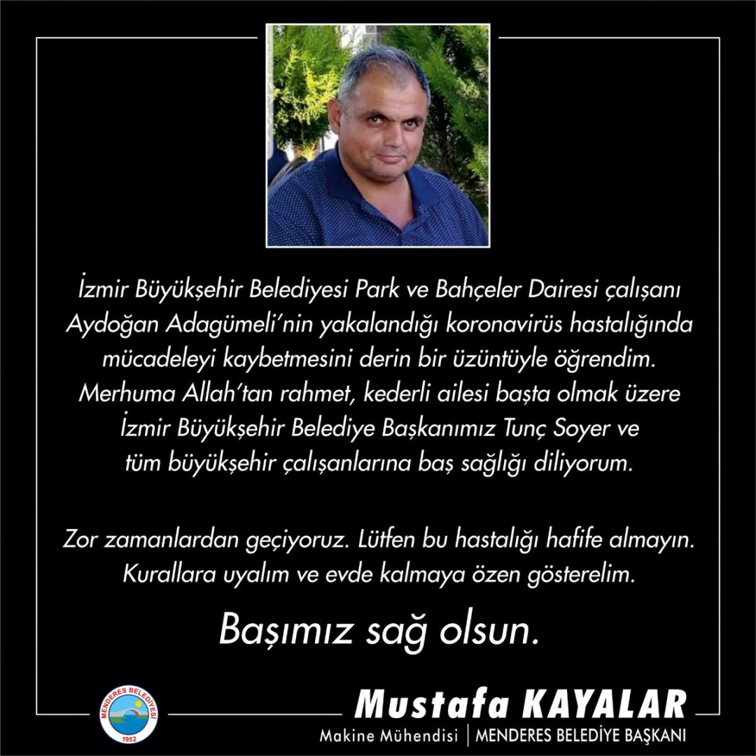 İzmir Büyükşehir Belediyesi'ne bağlı İzenerji şirketinde kadrolu çalışan Park ve Bahçeler Dairesi görevinde bulunan Aydoğan Adagümeli, koronavirüsten hayatını kaybetti.
