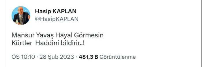 Mansur Yavaş'ın adaylık açıklamasına HDP'den tepki geldi. Sosyal medya hesabından paylaşımda bulunan HDP'li Hasip Kaplan, ABB Başkanı'nın adaylığına karşı çıktıklarını ifade ederek "Mansur Yavaş hayal görmesin. Kürtler haddini bildirir." dedi.