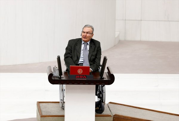 Ankara'da tedavisi süren ve Meclis Genel Kurulu'na tekerlekli sandalye ile gelen CHP'nin Antalya Milletvekili Deniz Baykal (80) kendisi için hazırlanan platform ile kürsüye çıktı.