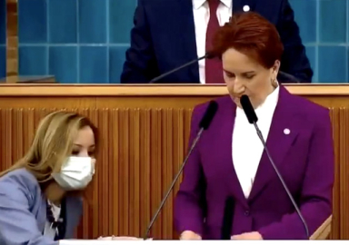 Önündeki kağıtları toplamaya çalışan Akşener'in gerginliği yüz ifadesine yansırken, "Elektronik bir arıza var herhalde. Var benim önümde, şimdi oradan bakacağım." dedi.