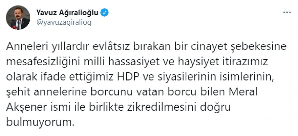 İYİ Parti Genel Başkan Yardımcısı ve İstanbul Milletvekili Yavuz Ağıralioğlu, İstanbul Büyükşehir Belediye (İBB) Başkanı Ekrem İmamoğlu'nun yaptığı 8 Mart Dünya Kadınlar Günü paylaşımına tepki göstererek, şu ifadeleri kullandı; ''Anneleri yıllardır evlâtsız bırakan bir cinayet şebekesine mesafesizliğini milli hassasiyet ve haysiyet itirazımız olarak ifade ettiğimiz HDP ve siyasilerinin isimlerinin, şehit annelerine borcunu vatan borcu bilen Meral Akşener ismi ile birlikte zikredilmesini doğru bulmuyorum. Öcalan'a mektup yazdırılmasının milli iradeyi ne istikamette kamçıladığını ve ikinci seçimin sonuçlarına ne yönde tesir ettiğini hiç kimse unutmamalı! En başta da Ekrem Bey. Bu vesileyle başta şehit annelerimiz olmak üzere tüm kadınlarımızın 8 Mart Dünya Kadınlar Günü kutlu olsun.''
