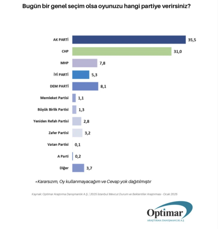 Anket sonuçlarına göre, AK Parti yüzde 35,5 oy oranı ile birinci, CHP ise yüzde 31 oy oranı ile ikinci sırada yer aldı.
