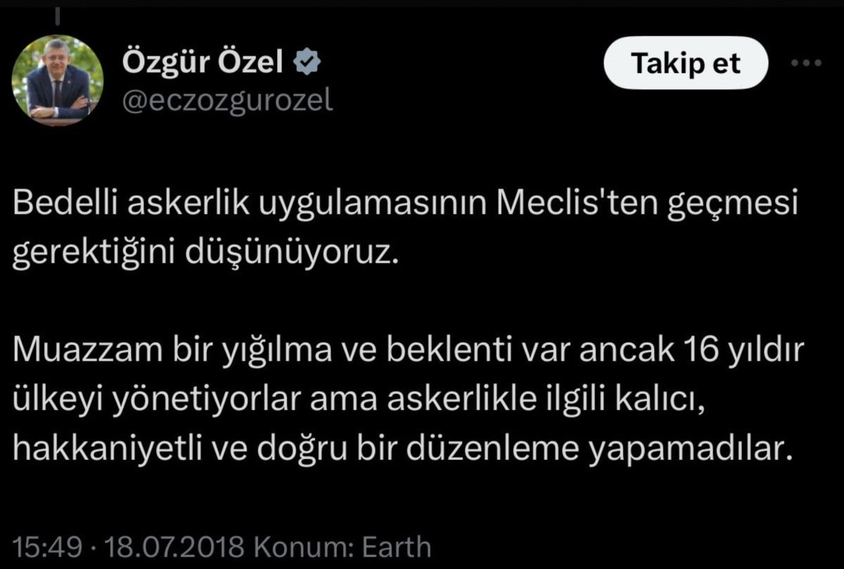 Yaptığı açıklamada 'Bedelli askerlik yapanlardan oy istemiyoruz' diyen Özgür Özel’in 2018 yılında paylaştığı 'Bedelli askerlik uygulamasının Meclis’ten geçmesi gerektiğini düşünüyoruz' paylaşımı yeniden gündem oldu.