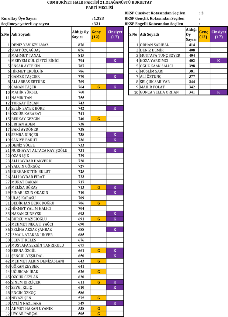Sonuçlara göre, Özgür Özel'in seçim öncesi yayınladığı 52 kişilik anahtar liste tamamen delegelerin onayını aldı. Diğer listelerden hiçbir isim PM'ye giremedi.