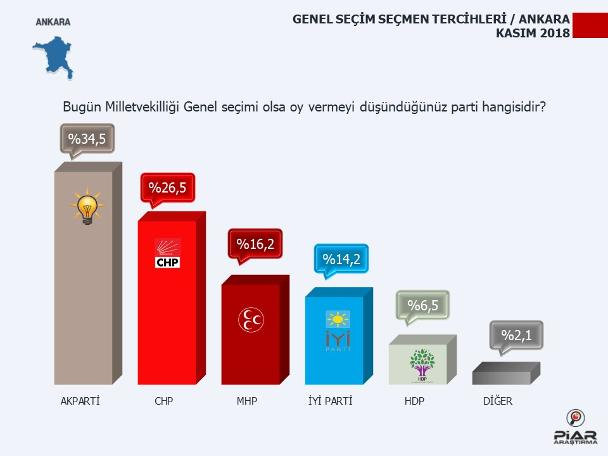 Ankara'da AK Parti'nin oy oranı yüzde 34.5. Bu oran CHP'de yüzde 26.5. Onu yüzde 16.2 ile MHP, yüzde 14.2 ile İYİ Parti izliyor.
