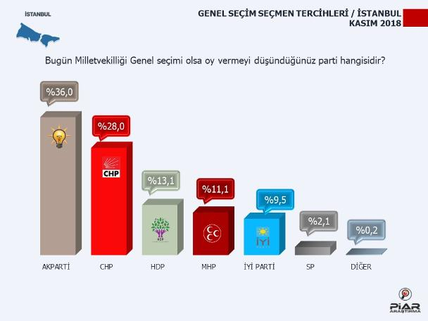 Kararsızlar dağıtıldığında İstanbul'da AK Parti'nin oy oranı yüzde 36, CHP'nin oy oranı yüzde 28. HDP'nin oyu yüzde 13, MHP'nin oyu yüzde 11.1, İYİ Parti'nin oyu yüzde 9.5.