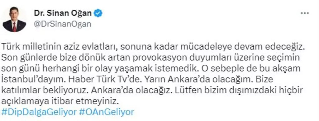 Sosyal medyadan bir açıklama yapan Oğan, şu ifadeleri kullandı; "Türk milletinin aziz evlatları, sonuna kadar mücadeleye devam edeceğiz. Son günlerde bize dönük artan provokasyon duyumları üzerine seçimin son günü herhangi bir olay yaşamak istemedik. O sebeple de bu akşam İstanbul'dayım. Haber Türk Tv'de. Yarın Ankara'da olacağım. Bize katılımlar bekliyoruz. Ankara'da olacağız. Lütfen bizim dışımızdaki hiçbir açıklamaya itibar etmeyiniz."