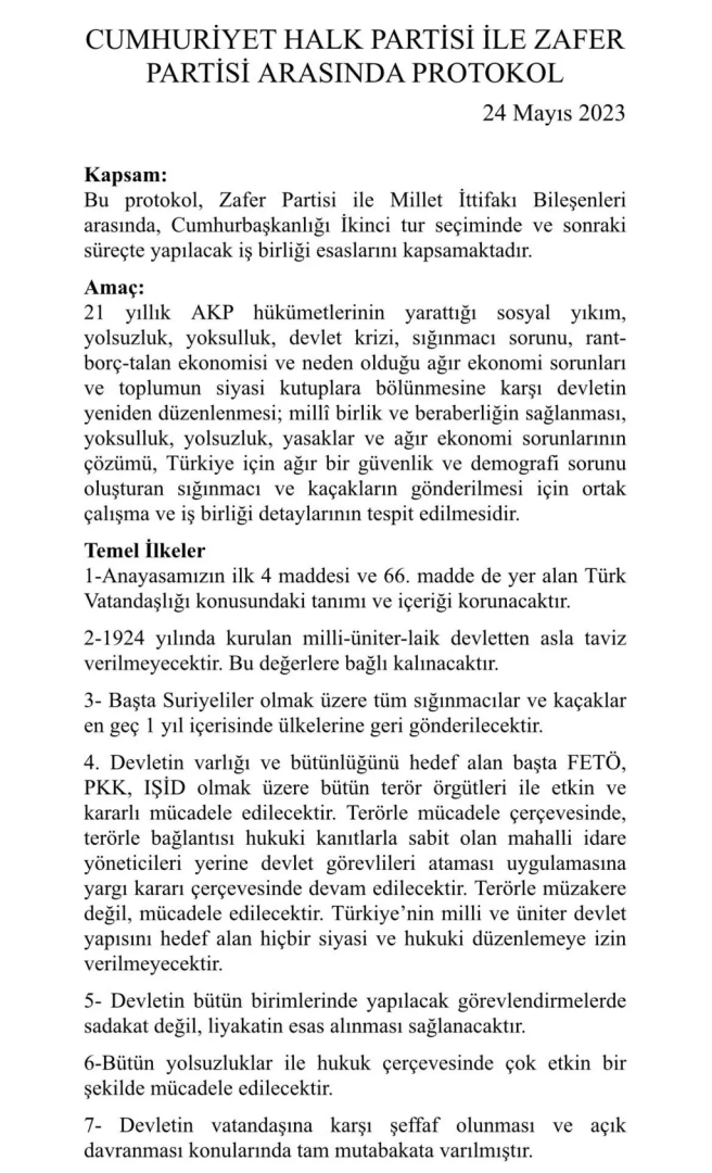 Zafer Partisi Genel Başkanı Ümit Özdağ, seçimin ikinci turunda Millet İttifakı Cumhurbaşkanı Adayı Kemal Kılıçdaroğlu arasında bir protokol metni imzalandı. İşte kamuoyu ile paylaşılan maddeler;