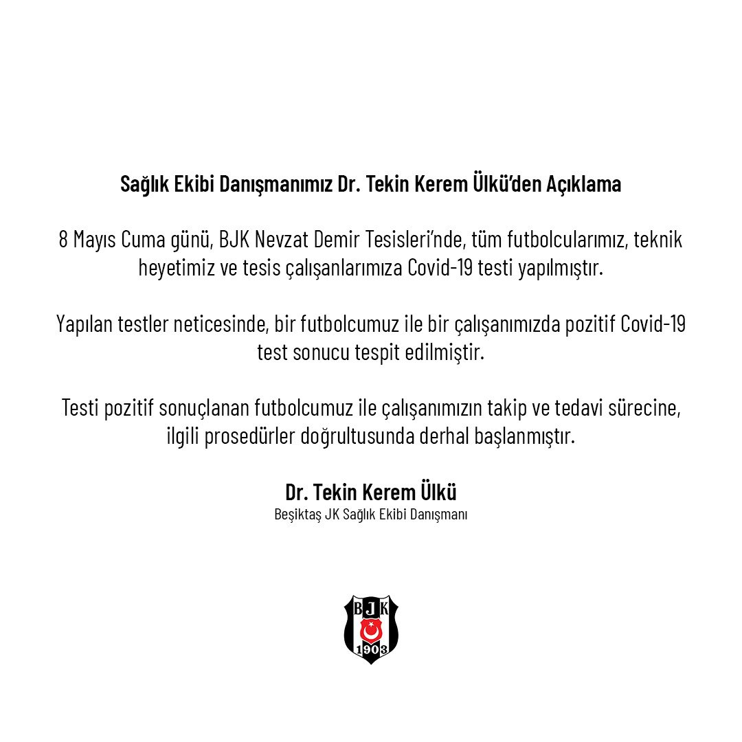 "8 Mayıs Cuma günü, BJK Nevzat Demir Tesisleri'nde, bütün futbolcularımız, teknik heyetimiz ve tesis çalışanlarımıza korona testi yapılmıştır. Yapılan testler sonucunda, bir futbolcumuz ile bir çalışanımızda pozitif koronavirüs olduğu tespit edilmiştir. Testi pozitif sonuçlanan futbolcumuzla çalışanımızın takip ve tedavi sürecine, ilgili prosedürler çerçevesinde hemen başlanmıştır."