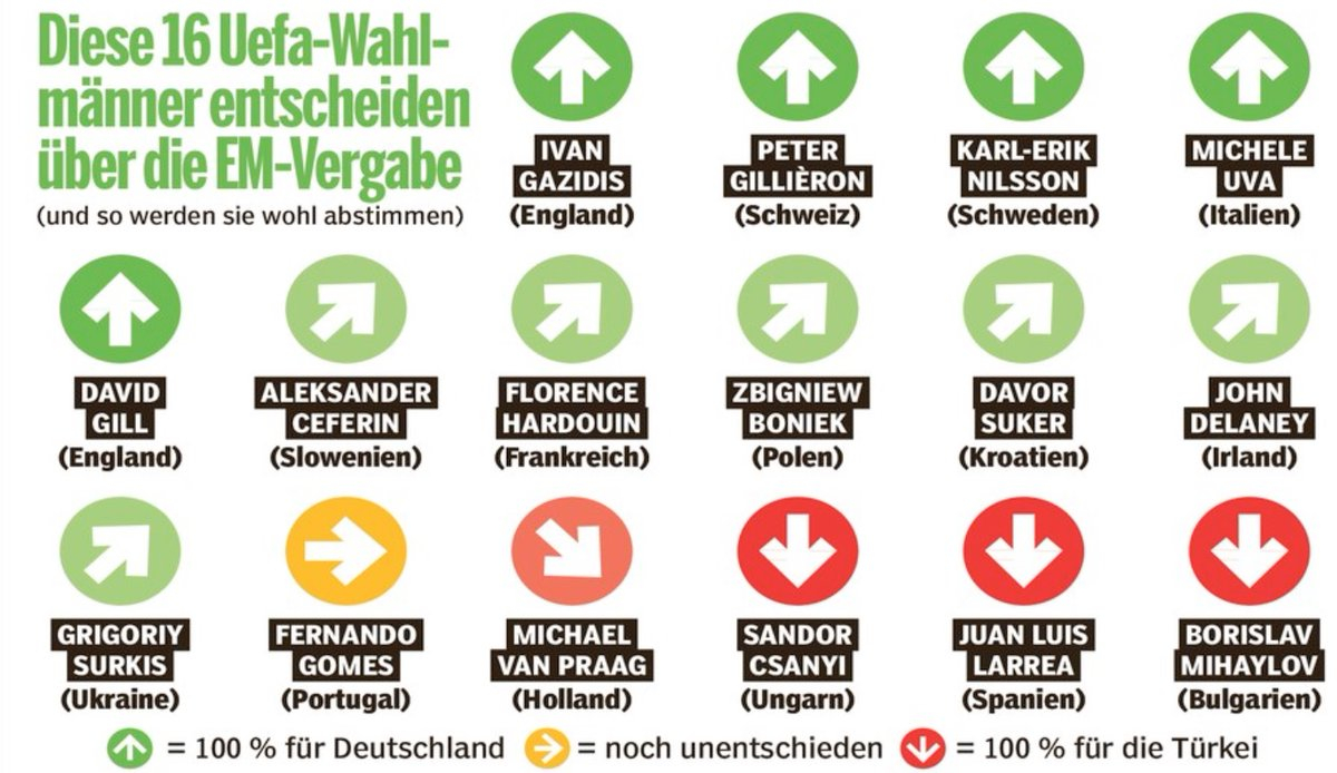 Bild gazetesinin pazar eki olan Bild am Sonntag, hangi UEFA Yönetim Kurulu üyesinin kime oy vereceğini isimleriyle birlikte açıklamış ve iki ülkenin alacağı oy sayılarını detaylarıyla sütunlarına taşımıştı.