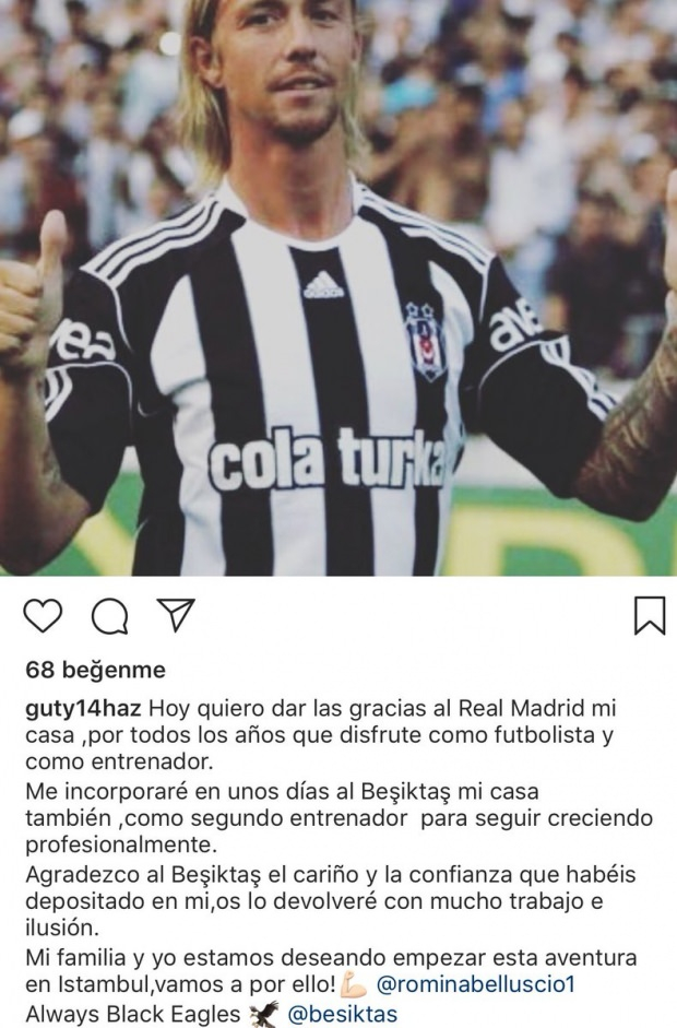 Sosyal medya hesabı üzerinden bir mesaj yayınlayan genç çalıştırıcı, Real Madrid'den ayrılıp, siyah beyazlı kulüpte yardımcı antrenör olarak görev yapacağını dile getirdi. Guti Hernandez, "Futbolcu ve antrenör olarak görev yaptığım ve çok keyifli zamanlar geçirdiği evim Real Madrid'e teşekkür ediyorum. Birkaç gün içerisinde bir diğer evim gördüğüm Beşiktaş'ta yardımcı antrenör olarak profesyonel açıdan gelişim sağlamak amacıyla göreve başlıyorum. Bana güvenen Beşiktaş camiasına minnetarım ve onların bu inancına çok çalışarak karşılık vereceğim. Ben ve ailem İstanbul'da yeni bir maceraya başlamak için heyecanla bekliyoruz" ifadesini kullandı.