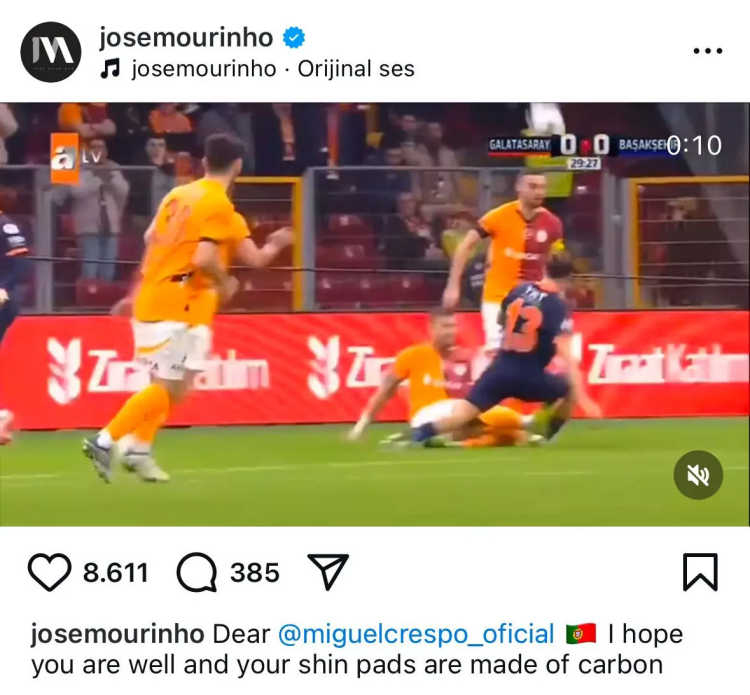 Fenerbahçe Teknik Direktörü José Mourinho, Galatasaray ile Başakşehir arasında oynanan maçta, Crespo'nun ceza sahasında yerde kaldığı bir pozisyonu sosyal medya hesabından paylaştı. Bu paylaşım, Galatasaray camiasını kızdıracak bir detay olarak gündeme geldi. Mourinho, paylaşımında "Umarım iyisindir" ifadesini kullanarak, pozisyonla ilgili tepkisini dolaylı yoldan gösterdi.