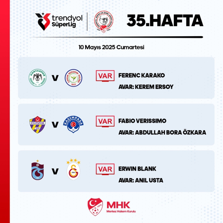 MHK'den yapılan açıklamaya göre; dev karşılaşmada VAR hakemi olarak Hollandalı Erwin Blank görev yapacak.