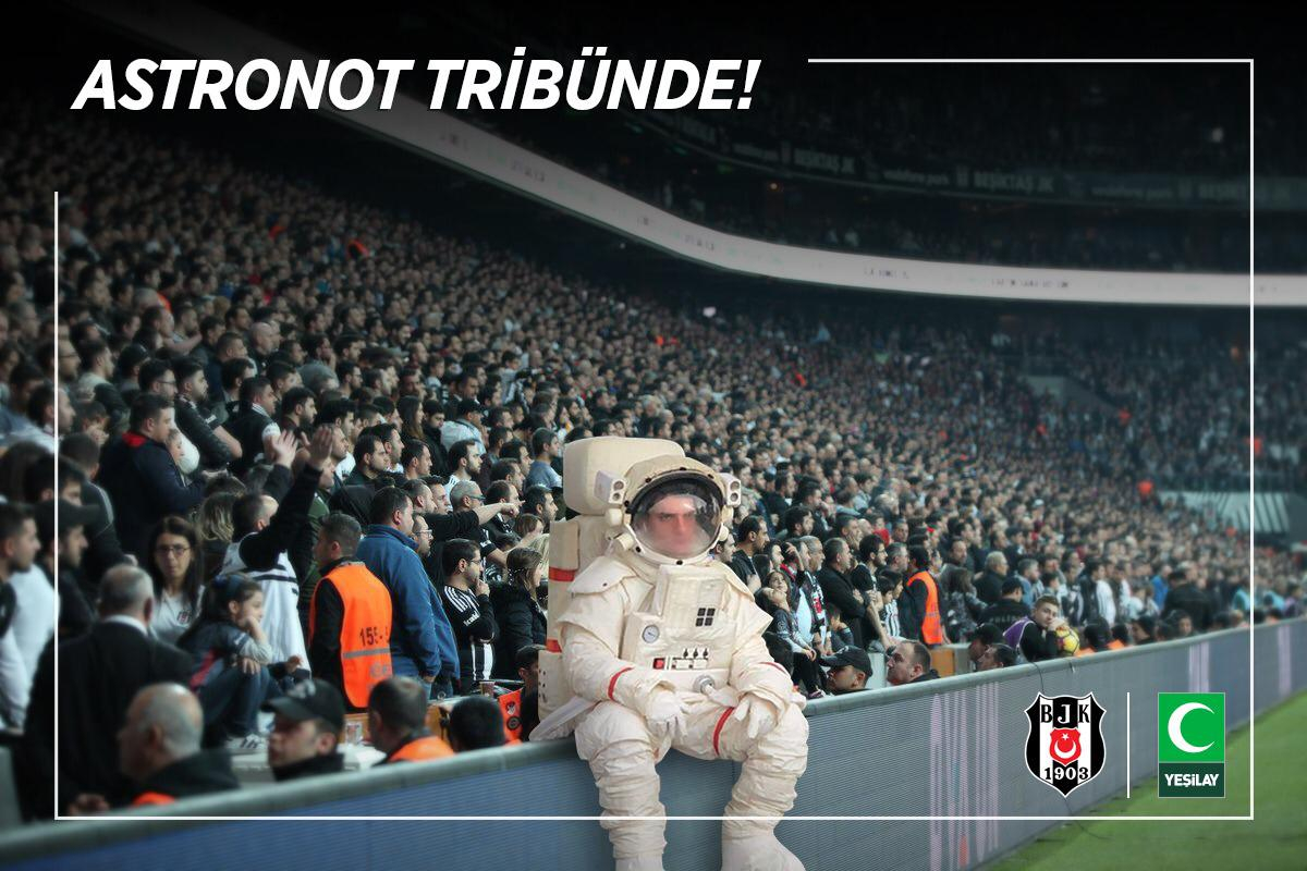 Beşiktaş'ın da sosyal medya hesabından yaptığı paylaşımda astronotun Beşiktaş tribünündeki görüntüleri yayınlandı: