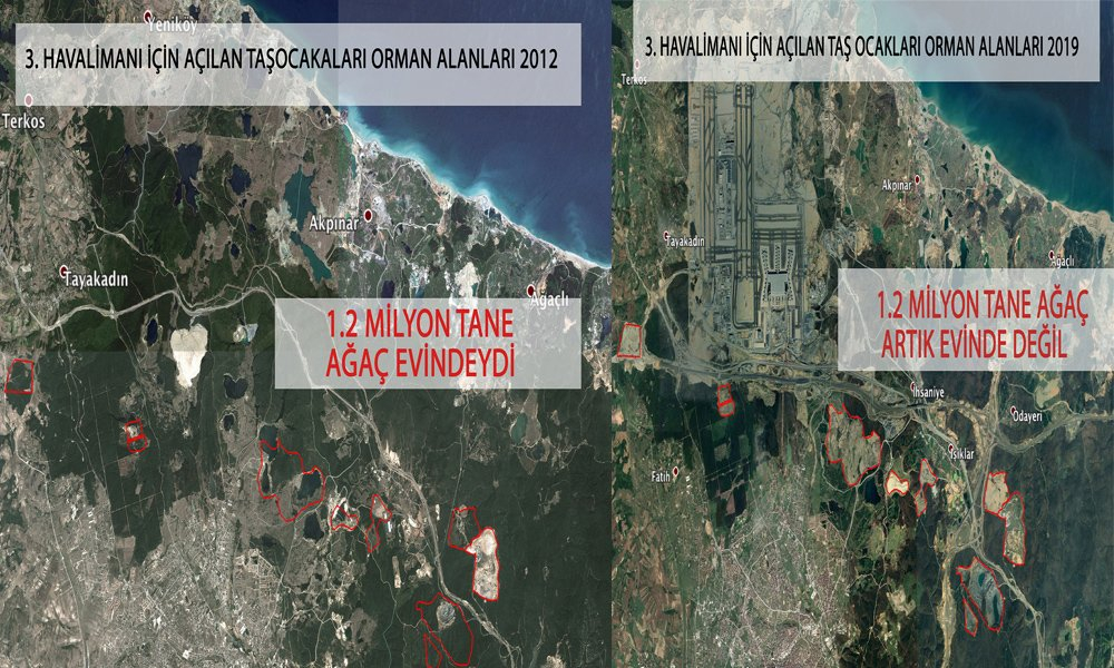 Yapılan hesaba göre, 3. Havalimanı ile çevresindeki havalimanı inşaatı için açılan taş ocaklarıyla, havalimanına giriş olan Kuzey Marmara Otoyolu da katıldı. Bunlara göre 3. Havalimanı için hazırlanan kesilecek ağaç sayısının 2 buçuk milyon olmadığı ve 13 milyona çıktığı saptandı. 2012/2019 arasında havalimanının proje sahasına tam 8 milyon ağaç, inşaatta 2 adet taşocağına en az olarak 1.2 milyon, havalimanına girişine ise Kuzey Marmara Otoyolu'na 3.7 milyon ağaç kesildi.