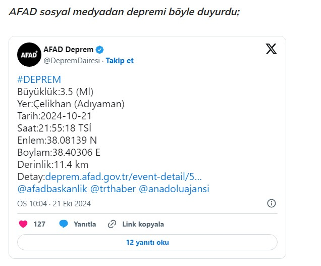 Adıyaman'ın Çelikhan ilçesinde 3,5 büyüklüğünde korkutan deprem yaşandı. AFAD'ın son dakika olarak duyurduğu deprem kısa süreli paniğe neden oldu.