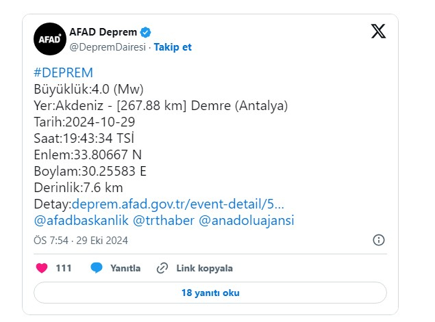 Afet ve Acil Durum Yönetimi Başkanlığı (AFAD), Antalya'nın Demre ilçesinde 4.0 büyüklüğünde bir deprem meydana geldiğini duyurdu.