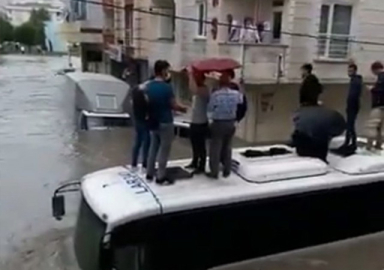 Mahsur kalan bir minibüste yer alan yolcular da içeriye dolan sudan kaçmak adına minibüsün üstünde bulunan pencereden yukarı çıkarak, yardım gelmesini bekledi.