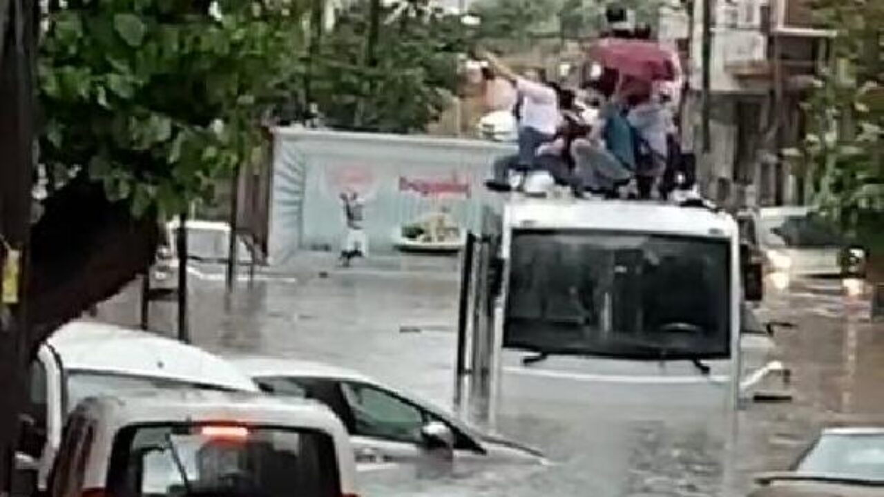 İstanbul'da bugün etkili olan dolu ve sağanak sebebiyle yollar göle döndü. Yolda mahsur kalan bir minibüsün üstüne çıkan yolcular kurtarılmayı bekledi.