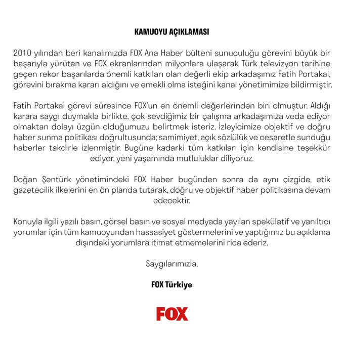 FOX Tv: Değerli arkadaşımız Fatih Portakal, görevini bırakma kararı aldığını bildirdi