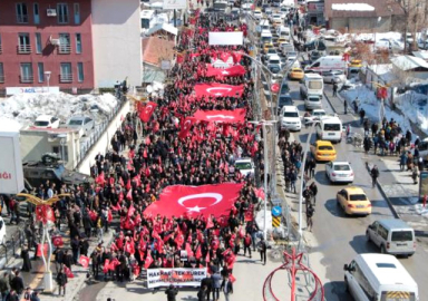 Binlerce kişi şehitlerimiz için 'Ne mutlu Türk'üm diyene' sloganlarını atarak, Hakkari sokaklarında bağıra bağıra İstiklal Marşı'nı okudu.