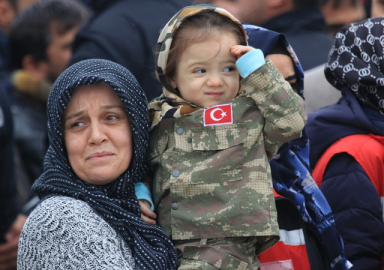 Şehidin eşi Berna Deprem, kucağındaki 2 yaşındaki oğlu Yağız Efe ile eşinin Türk bayrağına sarılı tabutunu öperek ağladı.