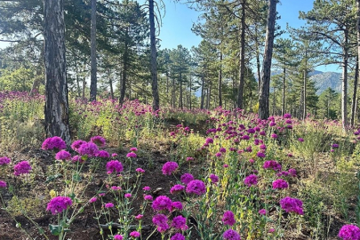 Karaçam ağaçlarından oluşan yemyeşil ormanın içinde mor rengiyle boy gösteren çiçekler, görsel şölen oluşturdu.