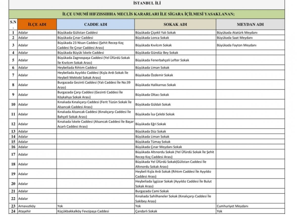 İstanbul'da sigara yasağı uygulanan sokakların listesi