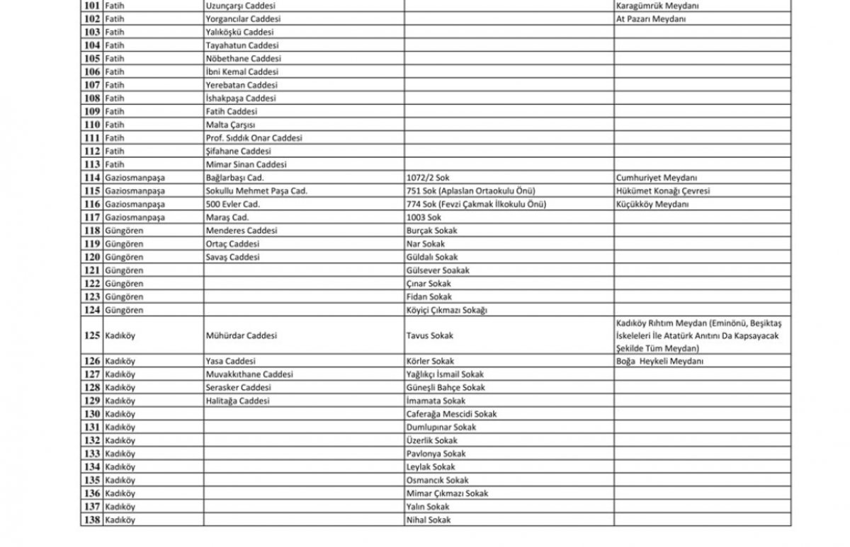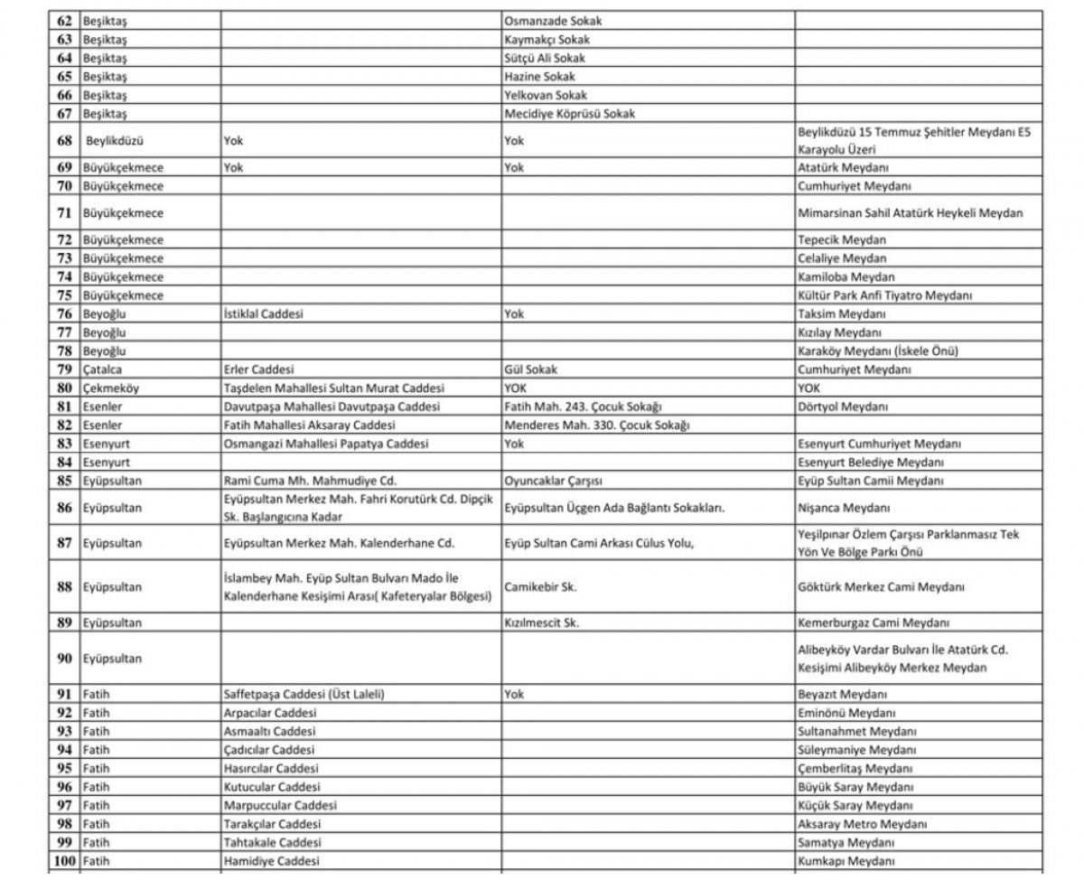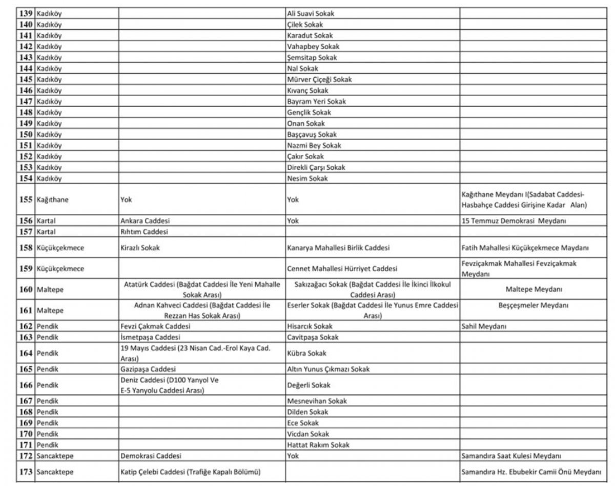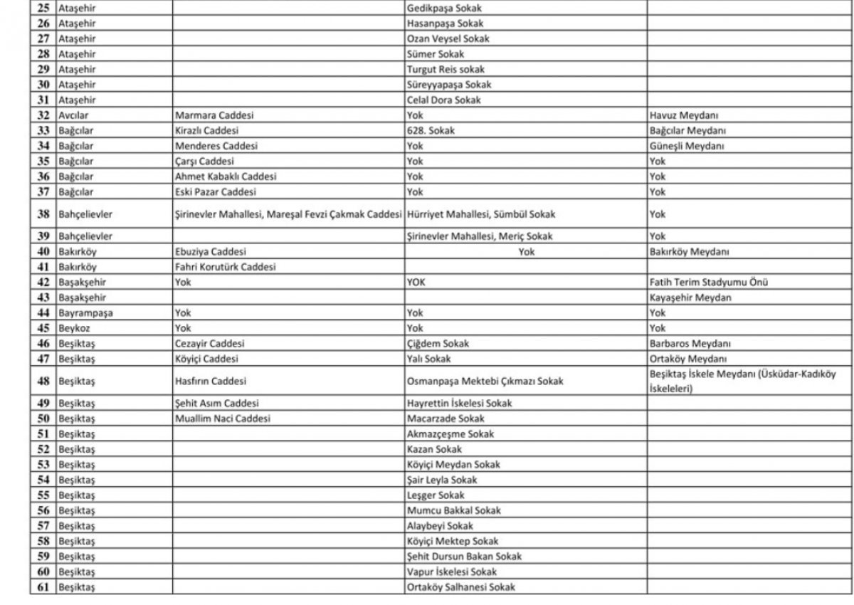 Valilik tarafından yayınlanan bu listede cadde, sokak ve meydan adı olmak üzere tüm ayrıntılara yer verildi.