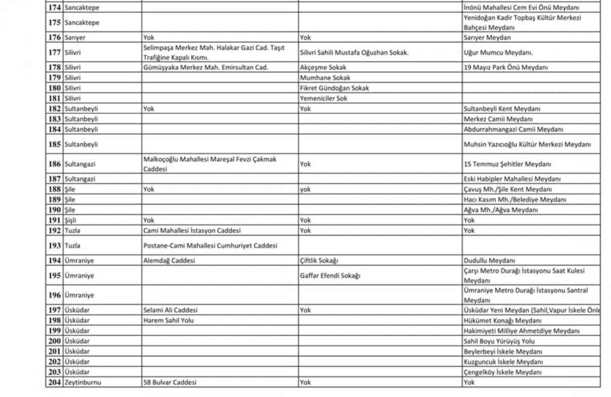 İstanbul Valiliği bu kararın ardından yasağın geçerli olduğu yerleri listeledi.