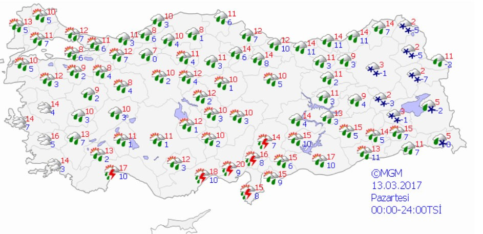 Meteoroloji'den yapılan açıklamada "Ülkemiz genelinin parçalı ve çok bulutlu, Orta ve Doğu Karadeniz kıyıları ile Kastamonu kıyıları, Bartın ve Sinop çevreleri dışında kalan bütün bölgelerimizin yağışlı geçeceği tahmin ediliyor. Yağışların; genellikle yağmur ve sağanak, yer yer gök gürültülü sağanak, Doğu Karadeniz'in iç kesimleri ile Doğu Anadolu'nun kuzey ve doğusunda karla karışık yağmur ve yükseklerinde yer yer kar şeklinde olması bekleniyor. Yağışların Doğu Akdeniz ile Muğla kıyıları, Antalya, Isparta'nın güneyi, Malatya, Elazığ ve Adıyaman çevrelerinde yer yer kuvvetli olması bekleniyor. Bu sabah ve gece saatlerinde iç ve doğu kesimlerde yer yer sis ve pus hadisesi ile birlikte Doğu Anadolu'nun kuzey ve doğusunda buzlanma ve don olayı beklenmektedir." denildi.