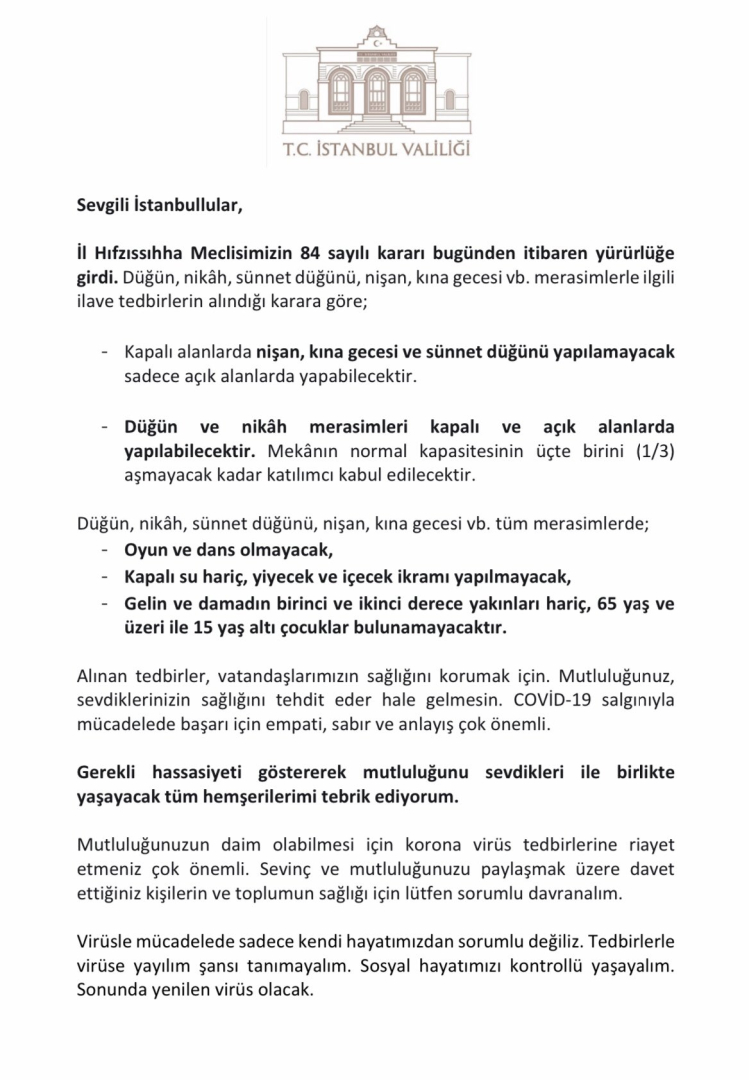 Sosyal medya üzerinden paylaşım yapan Yerlikaya, "Sevgili İstanbullular, İl Hıfzıssıhha Meclisimizin 84 sayılı kararı yürürlüğe girdi. Düğün, nikah, sünnet, nişan, kına gecesi v.b. etkinliklerle ilgili ilave tedbirler, mutluluğu yaşarken virüsü de mutlu etmemek, hastalığın yayılımının önüne geçmek için alındı" ifadelerini kullandı.