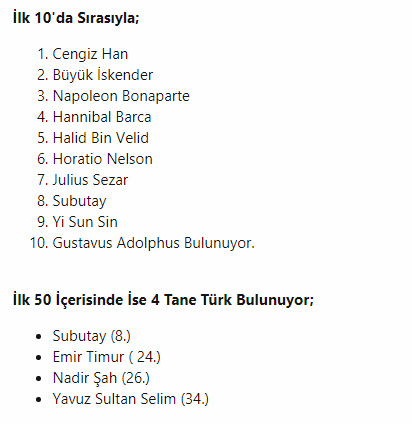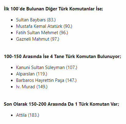 Dünyanın en büyük ilk 50 komutanları arasına Türk komutanlar, Cengiz Han'ın en büyük generali Subutay Bahadır sekizinci, Timur İmparatorluğu'nun kurucusu Emir Timur 24'üncü, İran Hükümdarı Nadir Şah 26'ncı, 9. Osmanlı padişahı Yavuz Sultan Selim 34'üncü oldu.
